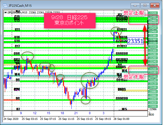 【日経225】9/28東京の展開は、23180=23370ゾーンで小動きと予想