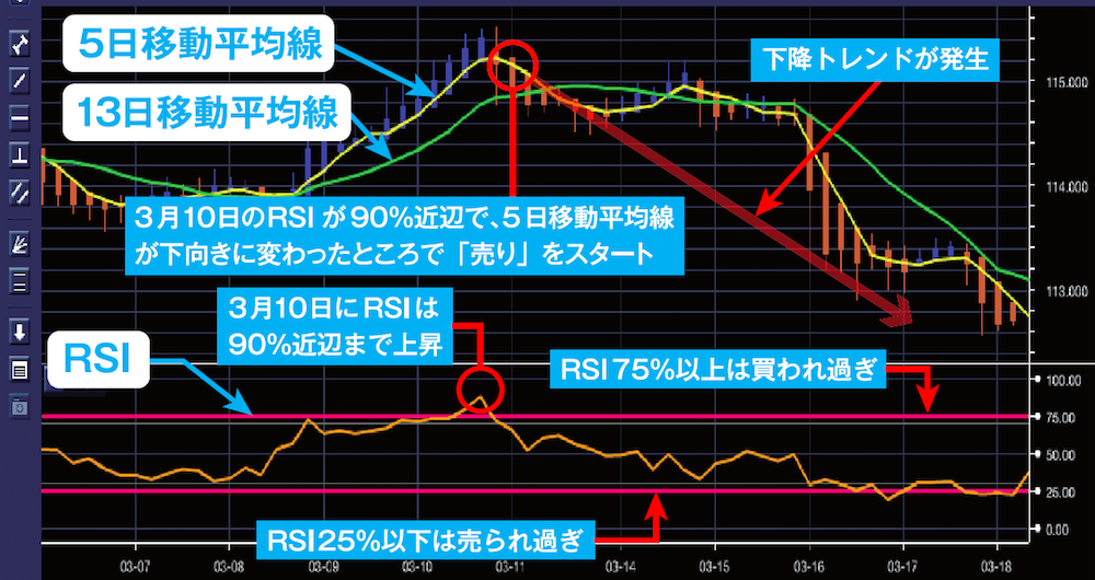 このとき、RSIのサインが出現するのですが、移動平均線がクロスしそうになければ無視します。今回ですと3月9日の部分がこれに当たります。この日、RSIは買われ過ぎ付近の75%まで上昇したものの、移動平均線がデッドクロスせず再び上昇に転じていることが分かります。このように、トレンド系とオシレーター系の方向性が一致しなければダマシなので、トレードは見送りとします。