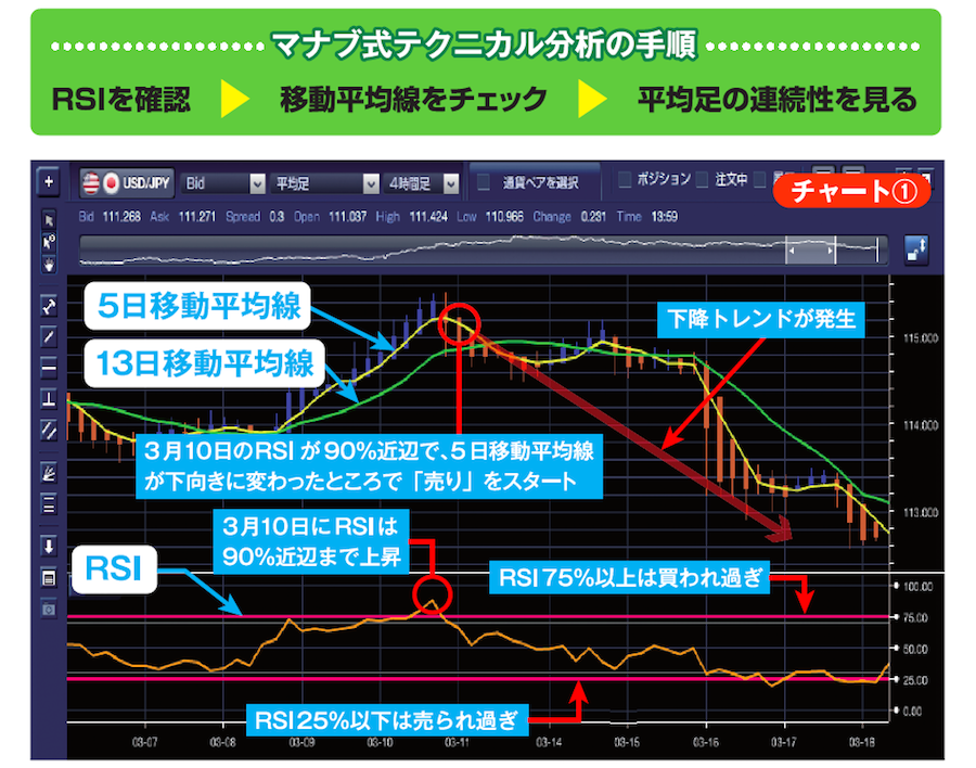 まず、チャート下部(チャート①)のRSIを確認し、過熱感を見ます。続いて、チャート上部の移動平均線を確認し、ゴールデンクロスまたはデッドクロスの出現をチェックするのです。