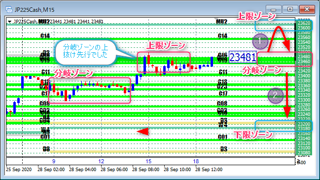 【NK225】9/28東京は、"分岐ゾーン"の下抜けでは無く、上抜け先行でした。