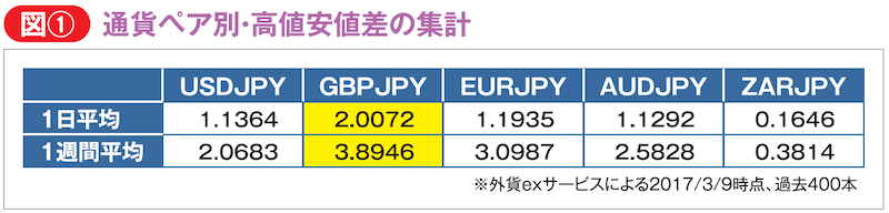 図①は、ドル円・ポンド円・ユーロ円・豪ドル円・ランド円の直近過去400本における、高値安値差を集計したデータです。例えば、ドル円とポンド円を比べてみると、ドル円は1日あたりの平均高値安値差が1.13円で、1週間あたりの平均高値安値差が2.06円。ポンド円は1日あたりの平均高値安値差が2.00円で、1週間あたりの平均高値安値差が3.89円となり、ポンド円の方がドル円よりボラティリティが高いといえます。