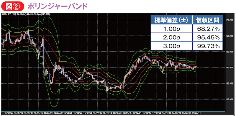 チャートのテクニカル指標で、ボリンジャーバンドというものがあります。これをチャートに描画すると任意期間の相場の振れ幅(ボラティリティ)が標準偏差で示され、ボラティリティの変化を可視化することができます。