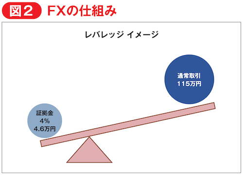 レバレッジとは、テコの原理という意味で、小さな力で大きな物を動かすことを指します。FXにおいては、上記の例に当てはめると、実際には115万円必要な取引を、4万6000円の資金で行えることから、レバレッジをかけているといわれます(図2参照)。少ない資金で取引が可能なため、資金効率が高いのです。