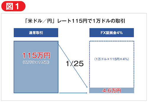 証拠金とは、実際の取引に必要な資金に対し、その担保として預ける資金のことをいいます。具体例ですと図1のように「米ドル/円」の取引1万通貨を1ドル115円のレートで取引したとして、実際の取引の場合は、115万円(115円×1万通貨)が必要になります。