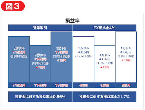 また損益比率においても、「米ドル/円」が1円変動した場合、1万通貨×1円=1万円となり、実際の取引金額115万円に対して0.86%ですが、FXでは証拠金4万6000円に対して21.73%となり、損益率は25倍になります(図3参照)。