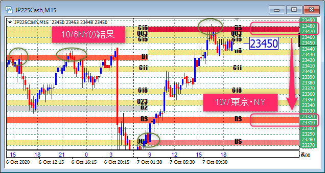 10/7東京は、上限とした23450=23480ゾーンまで上伸が実現。キレイに壁状態が続いており、これからの下落を期待。実現ならパーフェクト。(購入者への公開はこの部分を書き換えてください)