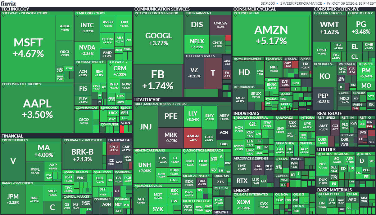 ほぼ全面高だった、今週の米国株市場。原油相場の40ドル台回復や追加経済対策成立期待もあるといったところ。(出典:finviz.com)