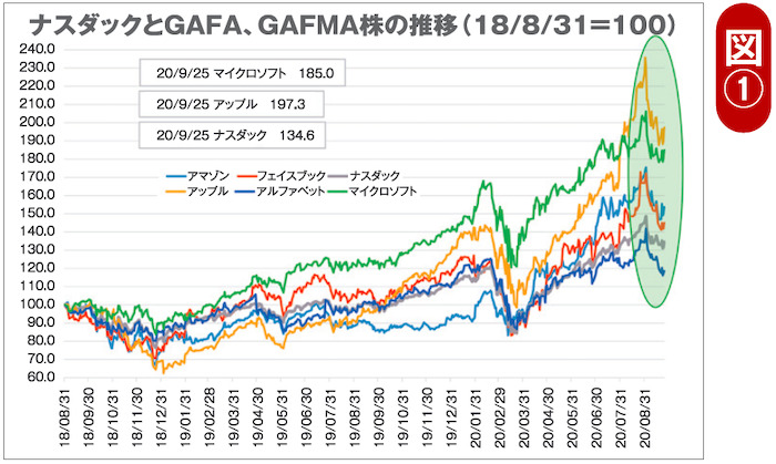 まず、アップルだが、8月31日に1対4分割を行い、9月2日までは最低投資金額が下がったことからさらなる流動性相場が期待され、株価は上昇したものの、その後は株数増加による「一部利食い」の動きが大きく出た。テスラの分割は1対5であったことから、なおさらである。図①は、2018年8月末を100とした旧GAFMA銘柄とナスダックの推移を示したものである。ピークであった今年9月2日にナスダックは148.7と、約1.5倍に上昇したが、アップルの同日の値は230.9となっている。また、GAFMAではないが、テスラの値はなんと741.5にまで上昇していたのである。
