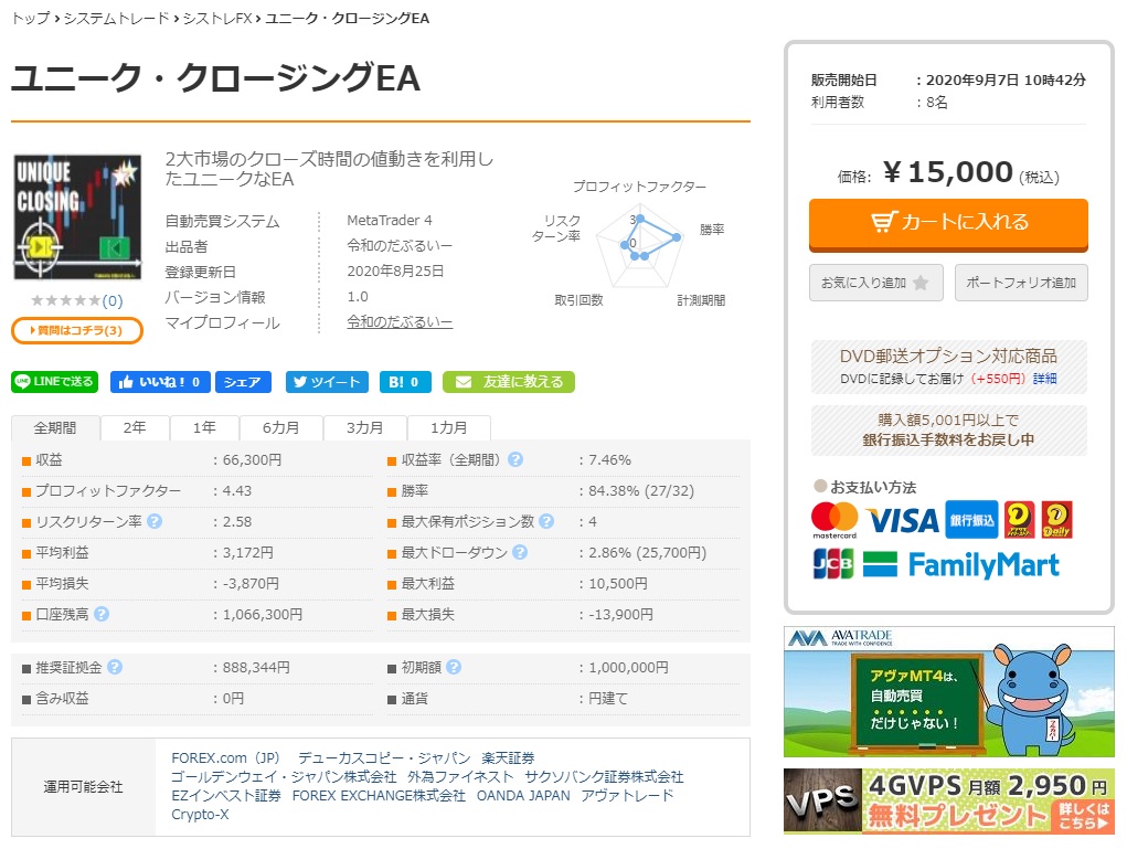EA開発者の令和のだぶるいーです。トレンドマイスターGBPJPYが販売開始から絶好調です。1ロットで45万の収益になっていますが、これは450pipsということです。約1ヶ月で450pipsというの