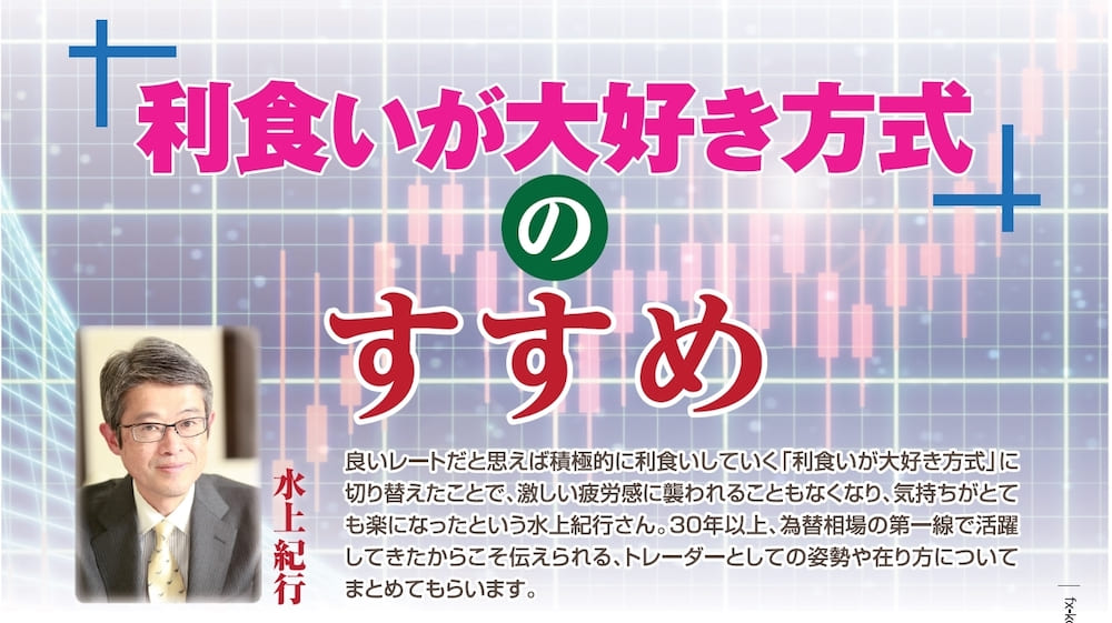 良いレートだと思えば積極的に利食いしていく「利食いが大好き方式」に切り替えたことで、激しい疲労感に襲われることもなくなり、気持ちがとても楽になったという水上紀行さん。30年以上、為替相場の第一線で活躍してきたからこそ伝えられる、トレーダーとしての姿勢や在り方についてまとめてもらいます。