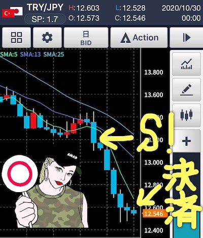 たらればいってもしかたないのですが、チャートを見てみるとこの日エントリーしていれば結果的に利食いになっていました。連勝を逃しました。