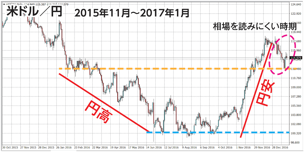 ここで私が具体的にどのように長期的に相場を考えているのかを説明しましょう。チャートは2015年11月から最近までの「米ドル/円」の値動きです。赤い直線は安値を結ぶ支持線で、その支持線が引ける時期は相場の流れが上昇、下降している期間なので、相場の流れが予想しやすい時期です。