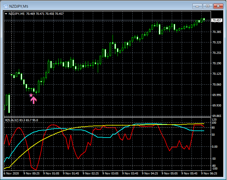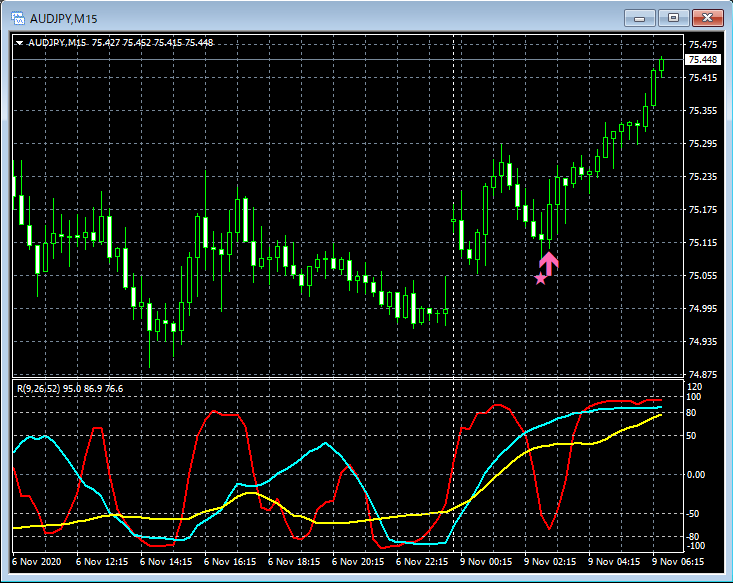 11月9日~11月13日において、mBDSR(RCI2本フィルターバージョン)のサインが上手く機能したと思われる例をピックアップして2つの記事に分けて紹介します。これはその1つ目の記事です。