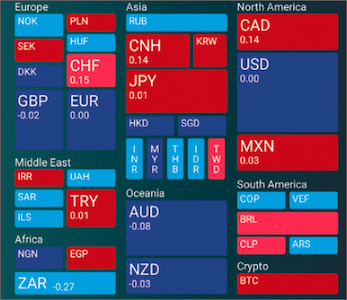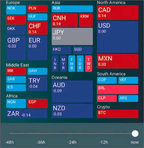世界中のほぼ全ての通貨の勢いが表示されている。ピンクになるほど強く、水色になるほど弱い。