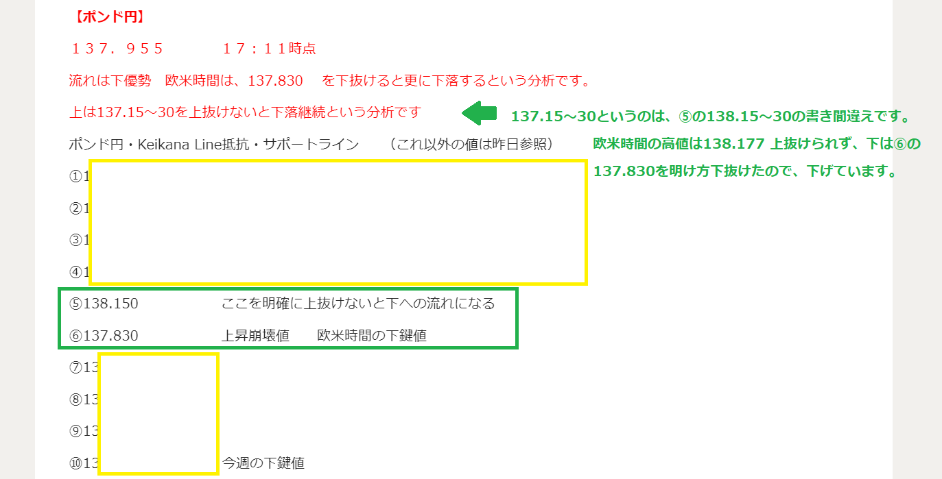 *上は分析通り、⑤の138.150まで戻せず、下の鍵値⑥を下回ったので更に下落しています。