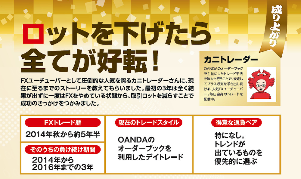 FXユーチューバーとして圧倒的な人気を誇るカニトレーダーさんに、現在に至るまでのストーリーを教えてもらいました。最初の3年は全く結果が出ずに一度はFXをやめている状態から、取引ロットを減らすことで成功のきっかけをつかみました。