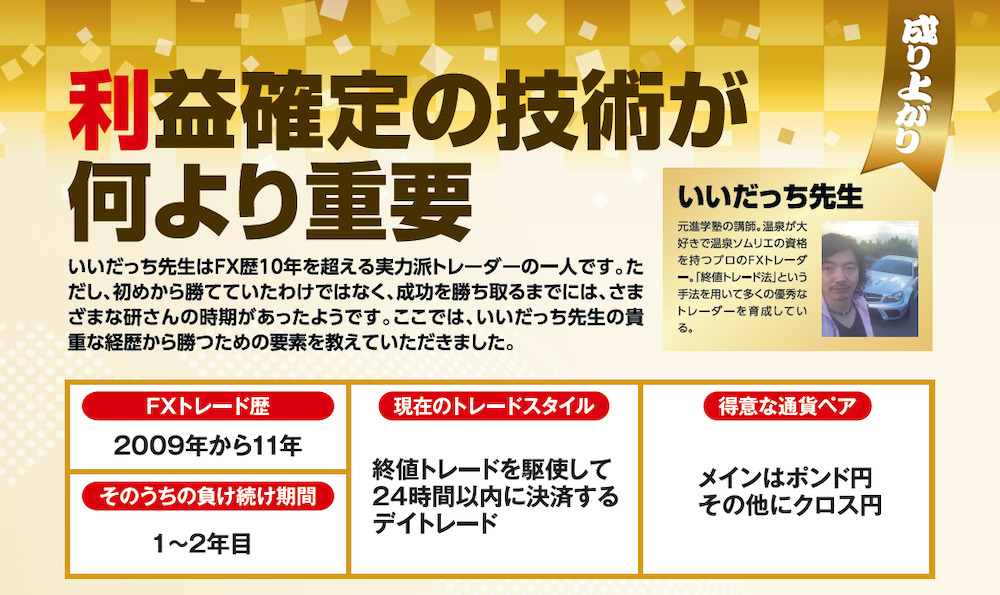 いいだっち先生はFX歴10年を超える実力派トレーダーの一人です。ただし、初めから勝てていたわけではなく、成功を勝ち取るまでには、さまざまな研さんの時期があったようです。ここでは、いいだっち先生の貴重な経歴から勝つための要素を教えていただきました。