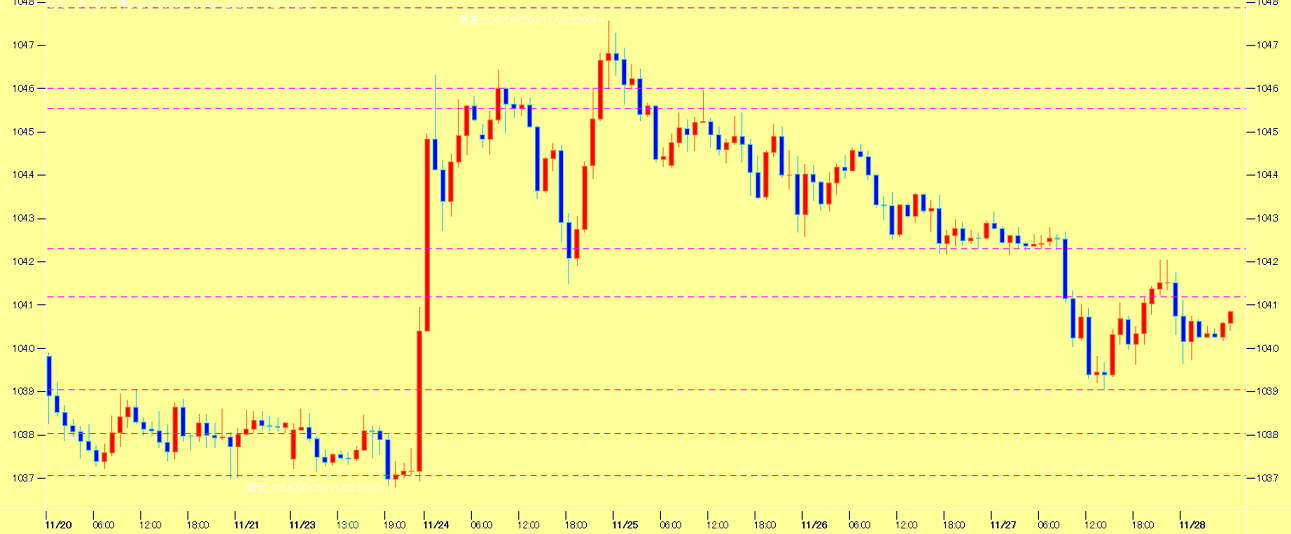 先週の振り返りと全く同じライン、1H足の表示のチャートです。