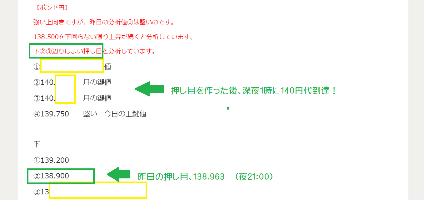 *こちらも、押し目は下②③と読んでいたのですが、さほど下げず②付近の138.963まで夜に下げ