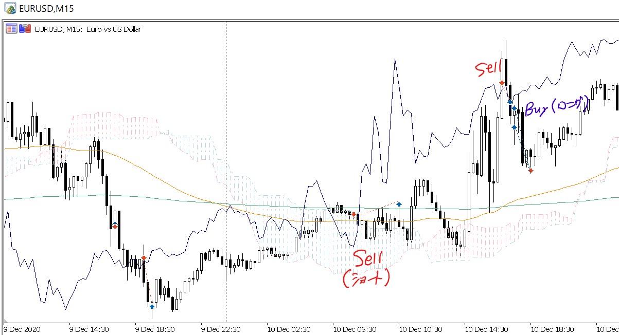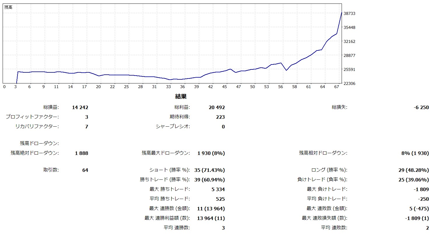 エントリーのタイミングをよく見ると、下落の途中で勝手にロングエントリーしています。相場は自分の思うようには動かない、ということは、戻り始めてからエントリーするのが確実なはずですね。