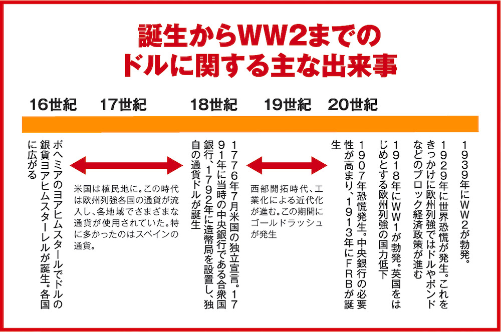 ドルは米国の独立と共に誕生します。その後は米国の経済発展、第一次大戦(WW1)、第二次大戦(WW2)を米国と共に経験しながら、1944年のブレトン・ウッズでの会議にて現在の基軸通貨ドルが誕生しました。