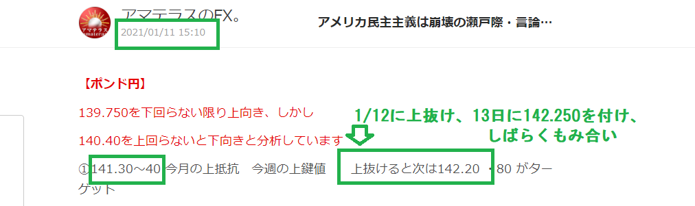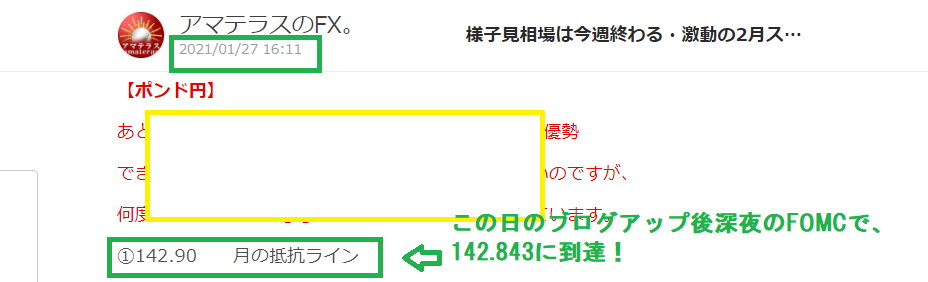 *次に、1月4日の月の値141.300を上抜く前日1月11日の記事です。