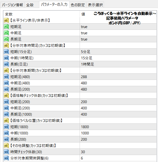 チャート表示に使用しているインジケータのパラメータ設定も公開しておりますので、当インジケータの購入を検討される方はもちろん、購入済の方も参考にして頂けるかと思います。