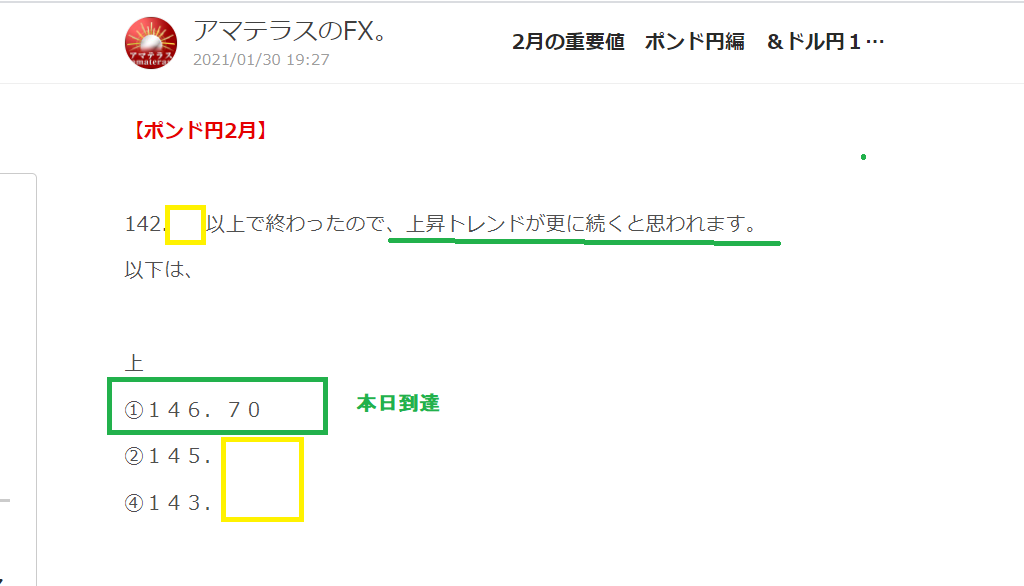 1月30日記事の2月のポンド円重要値は、昨日のもみ合い値でした。