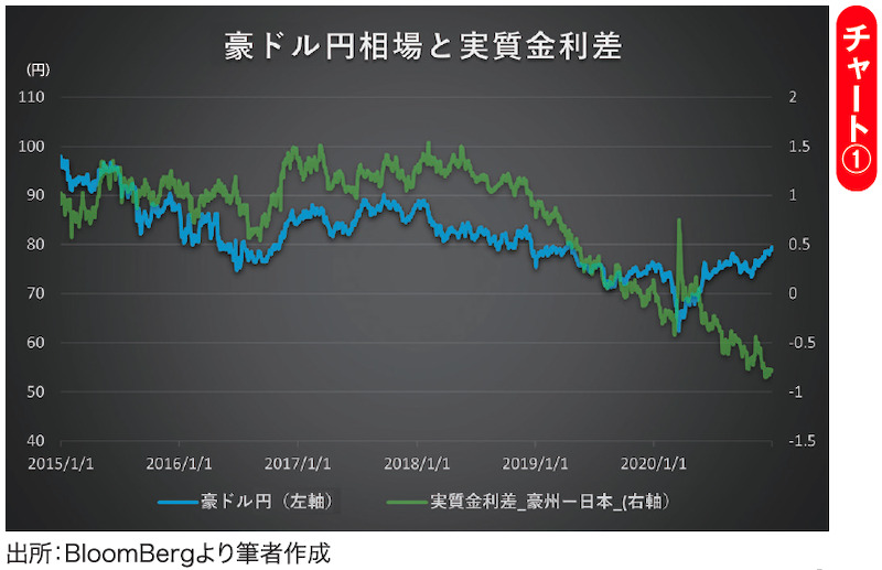 通貨ペアの推移を見るとき、多くの場合は金利差に着目します。ここでは、10年債利回りと期待インフレ率から算出した実質金利を用います。中長期的には、実質金利の高い通貨が買われ、実質金利の低い通貨が売られる傾向にあり、豪ドル円相場においても、2019年末までは、実質金利差の低下(豪州と日本の実質金利差が縮小)に連動するかたちで豪ドル安・円高が進行してきたと思われます(チャート①)。