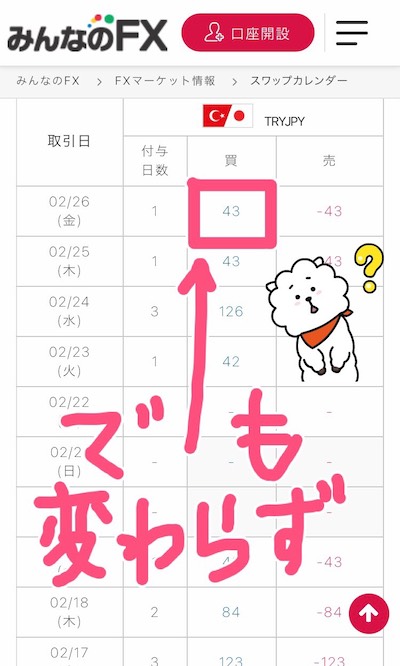 けれど、みんなのFXの受け取りスワップは、1万通貨あたり43円をキープ。
