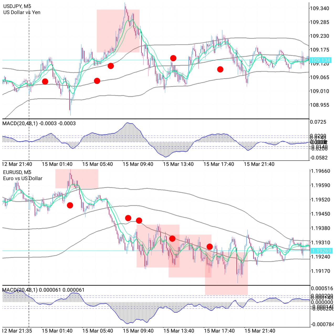 1分足でみれば、ドル円、ユーロドルともに