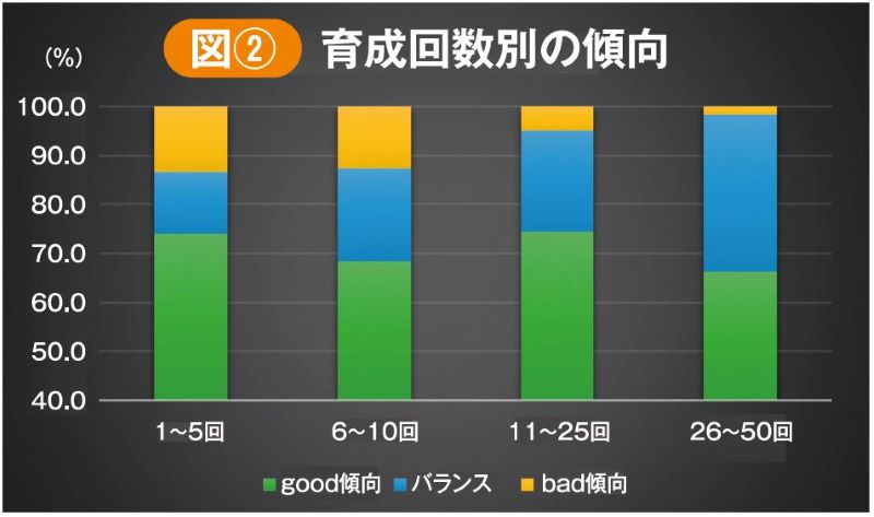 図②は、育成回数別でAIに対してどのような育成をしたのかの傾向を表したグラフになります(※2)。一番顕著に表れているのは、育成回数が多いほど“bad(叱る)”が少ないことではないでしょうか。人間同様に“褒めて伸ばすこと”が一番成果につながりやすいのかもしれませんね。