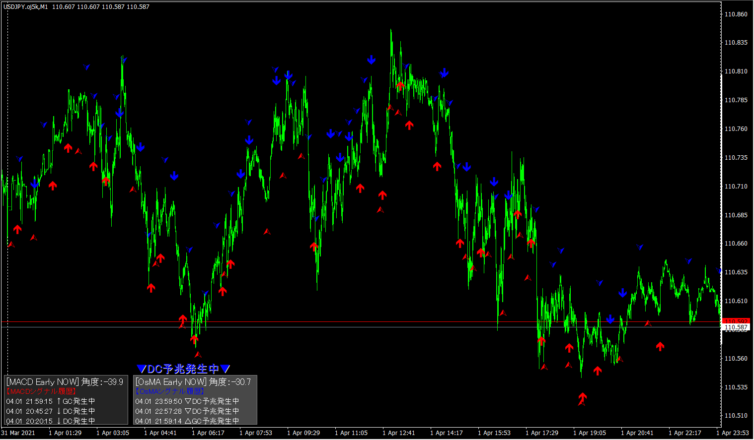 この2つのインジケーターを組み合わせて使用することにより、ゴールデンクロス/デッドクロスの発生シグナルと予兆が一緒に表示されるため、より早期察知の信頼性が高くなります。