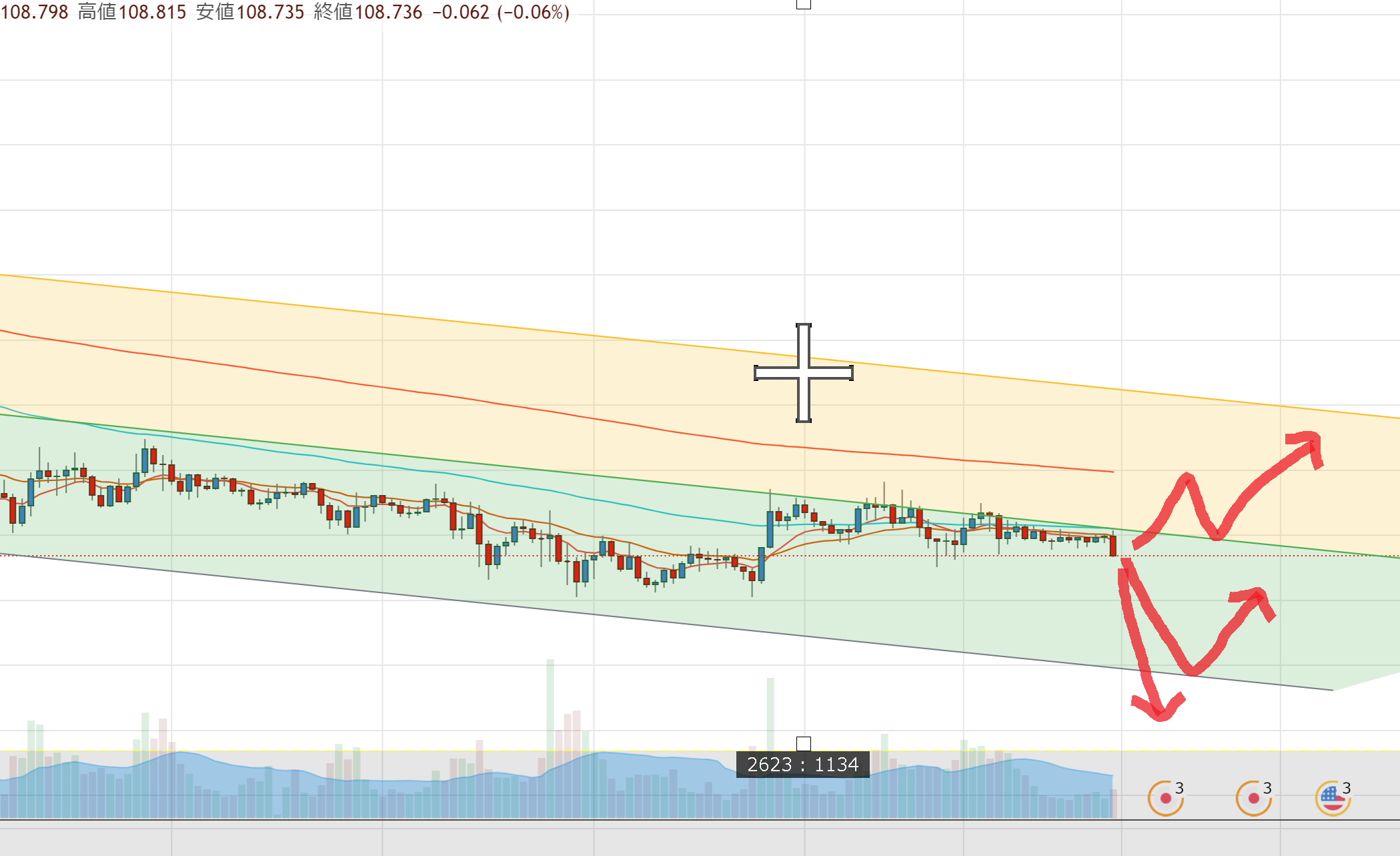 なのでチャートにラインを引いて過去現在未来を見るわけです。