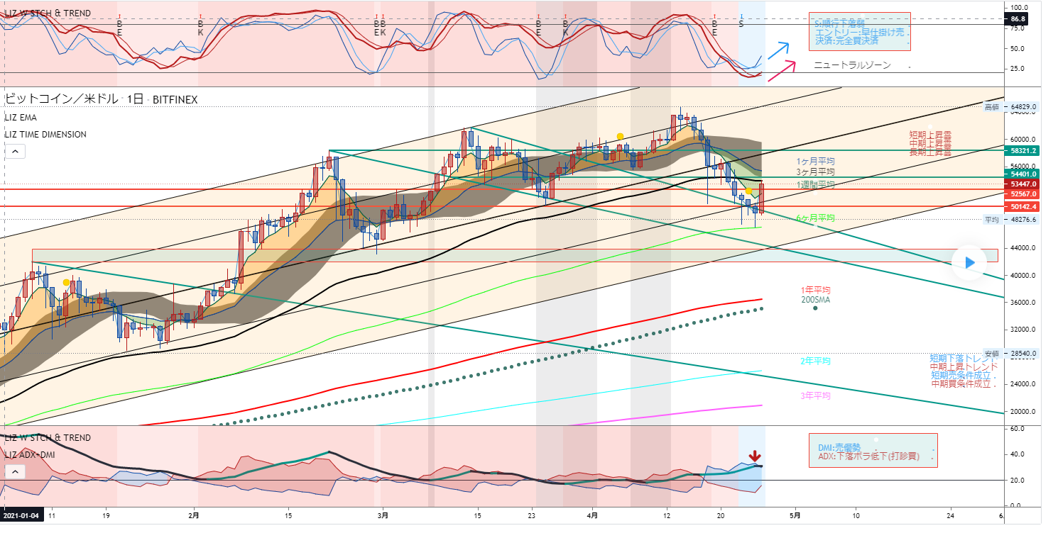 ストキャスは短期(青)中期(赤)とも上を向き、ADXは打診買いを示唆しています。