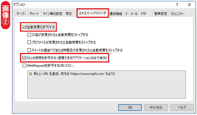 すると、新しく設定のウィンドウが立ち上がってきます。この立ち上がってきたウィンドウには複数のタブがありますので、その中の「エキスパートアドバイザ」のタブを選択してください。複数のチェック項目が表示されますので、その中の「自動売買を許可する」と「DLLの使用を許可する」にチェックを入れてOKボタンを押せば、MT4のオプション設定は完了です(画像②)。