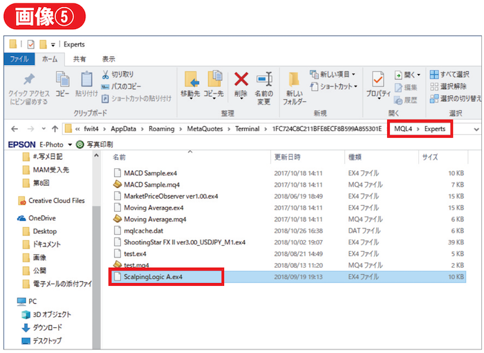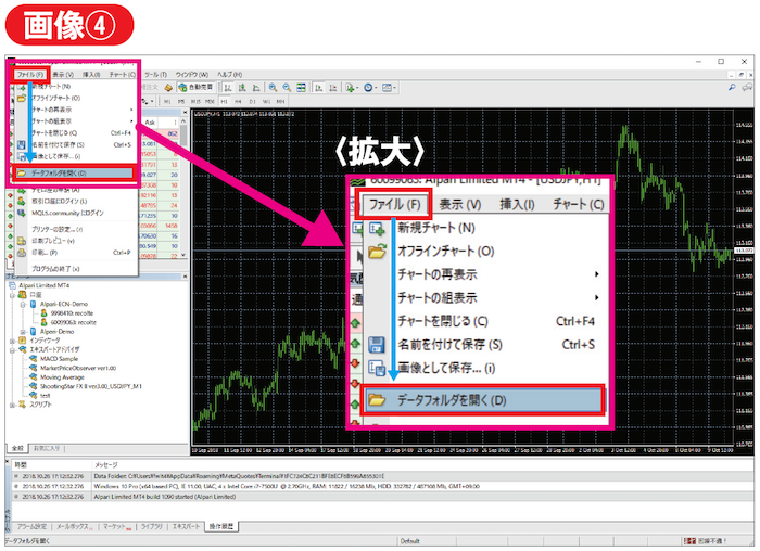 MT4のオプション設定が完了しましたら、次にEAのMT4へのインストールとなります。まずは、MT4の上部メニューより「ファイル⇒データフォルダを開く」を実行します(画像④)。ウィンドウが立ち上がるので、「MQL4⇒Experts」と順にフォルダを開き、Expertsのフォルダの中にEAファイルをコピーします(画像⑤)。