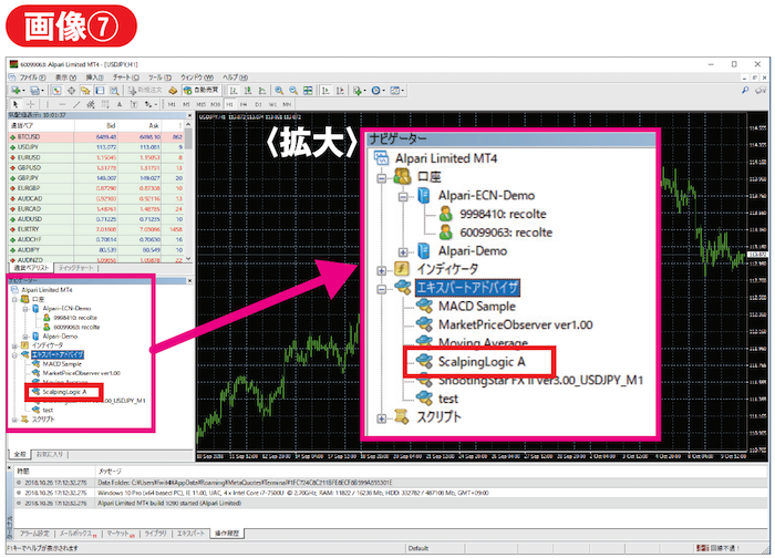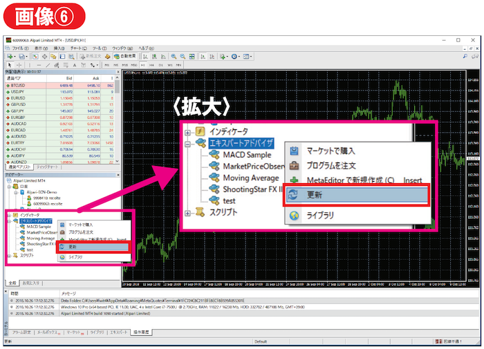 最後にMT4に戻り、左のナビゲーターウィンドウ内のエキスパートアドバイザのあたりで右クリックし、表示されるメニューより「更新」を実行します(画像⑥)。ナビゲーターウィンドウ上に該当のEA名が表示されれば、EAのMT4へのインストールは完了です(画像⑦)。