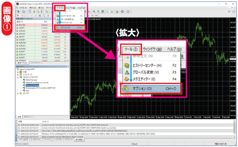 それでは、まずはMT4のオプション設定からです。オプション設定を行うために、MT4上部のメニューより、「ツール⇒オプション」を実行してください(画像①)。