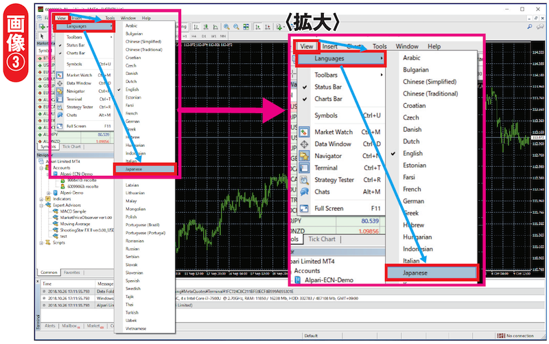 もしこの段階で、「自分のMT4は表示が全て英語表示になっている」という方がおられましたら、MT4の上部メニューより「View⇒Languages⇒Japanese」を実行してください。MT4の再起動後、表示が日本語に変わります(画像③)。