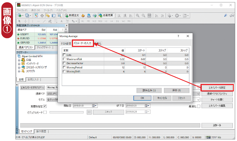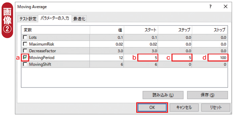まずはMT4のストラテジーテスターを開き、右側にある「エキスパート設定」ボタンを押し、出てきた画面の「パラメーターの入力」をクリックします(画像①)。そうすると、バックテスト時にも使用するパラメーター変更の画面が表示されます。パラメーター変更の画面が表示されたら、画像②のa~dの各項目を入力していきます。複数の値を試したいパラメーターのチェックボックスにチェックを入れます(画像②a)。