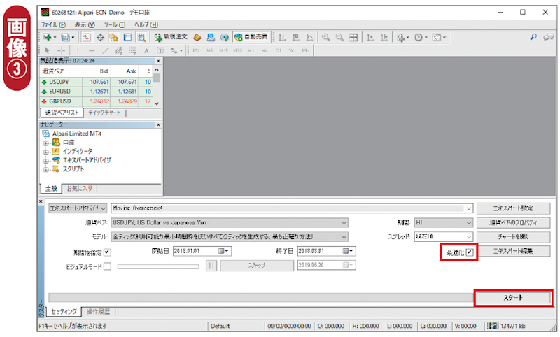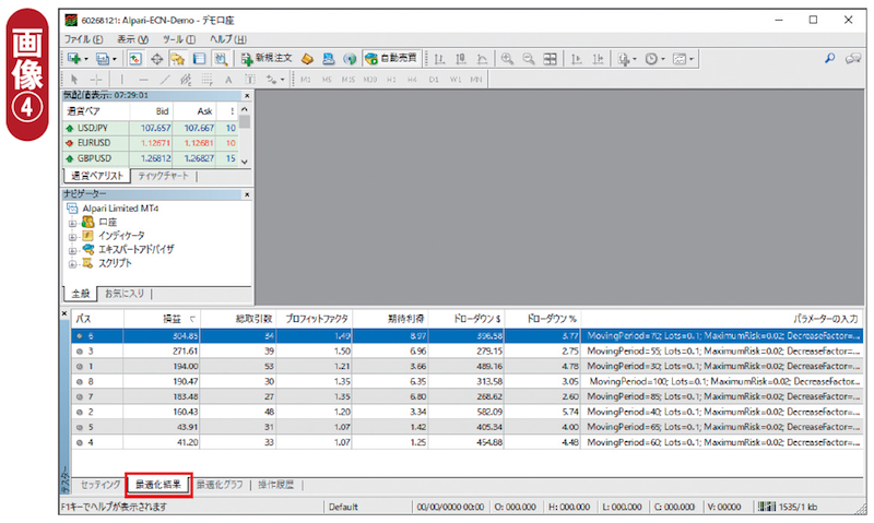あとは、通常のバックテスト通りに通貨ペアや時間足などを設定して「スタート」ボタンを押すと、複数の値を自動的にバックテストしてくれる最適化モードでのバックテストが実行されます。テストが完了すると、通常のバックテスト実行時にはなかった「最適化結果」というタブが表示されるはずなので、そちらを開いてみてください(画像④)。タブには、各設定値でのバックテスト結果が表示されます。