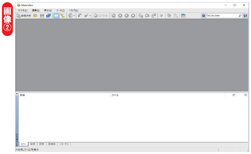 画像①は、MT4の画面です。この画面上の赤枠で囲まれたアイコンを押してみてください。そうすると画像②のような画面が表示されます。これが、「MetaEditor」と呼ばれるオリジナルのEAやインジケーターを作るためのツールです。このツールでEAを作るためのプログラミングや、プログラムに記述ルール上の間違いがないかのエラーチェックを行い、最終的に「ex4ファイル」と呼ばれる配布用のEAファイルを生成することができます。