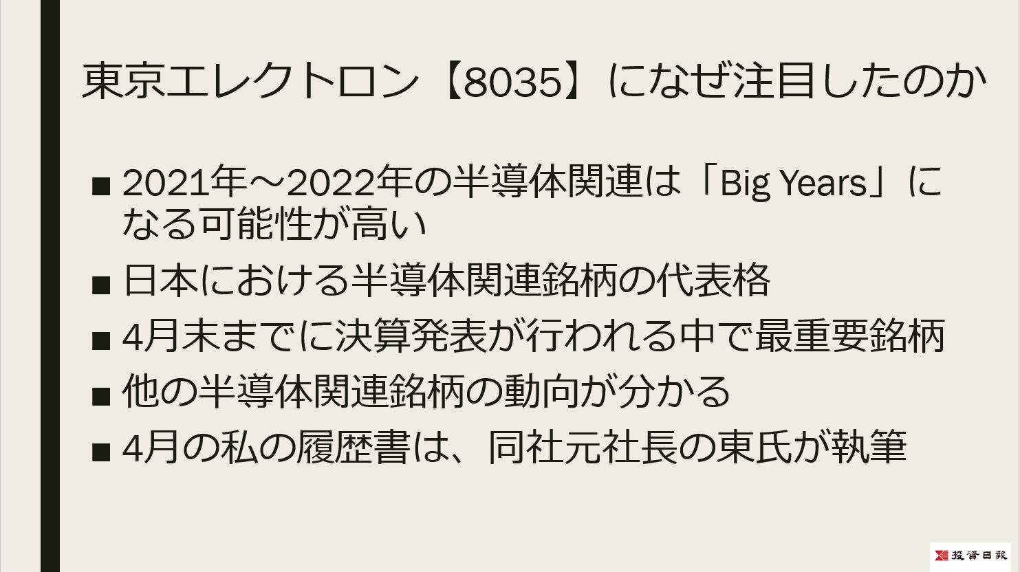 投資日報α2021年4月26日号 「投資家Sの今週の注目銘柄」で取り上げました、東京エレクトロン【8035】について解説しております