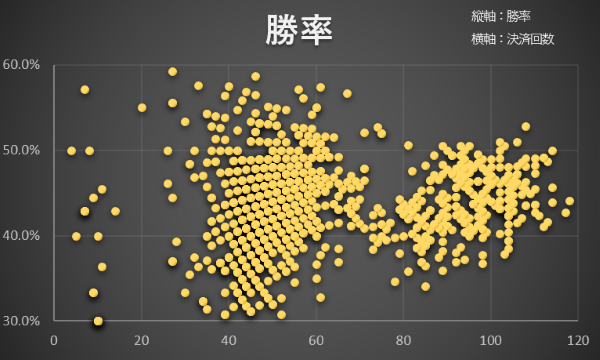 まず初めにご紹介するのは“勝率”のデータになります。以下のグラフでは各AIエージェントの決済回数と勝率を基にばらつきを表しています。