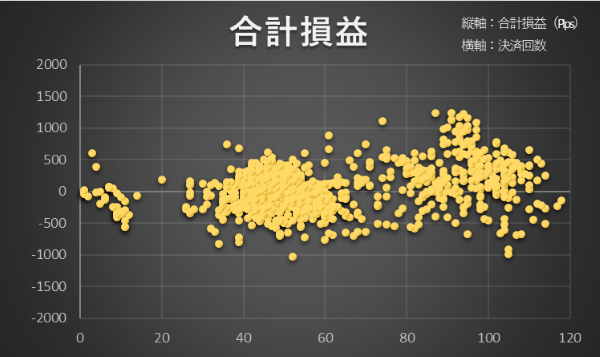 続いて、決済回数と合計損益の関係を見てみましょう。下のグラフは該当の期間における損益を合計した数値の分布です。合計損益についても勝率同様に極端に成績が変わっている様子はありません。