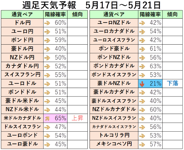 見てみると、米ドルカナダドルの陽線確率が65%、豪ドルNZドルは21%となっています。5月17日からの週は二つの通貨ペアしか傾向が出ておらず、特定の通貨が買われたり、売られたりという傾向はないようです。