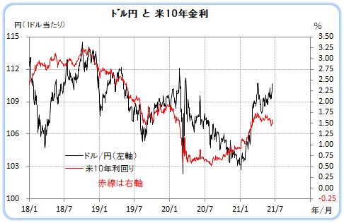 やや長めに、円/ドルと米10年金利の関係を見ると、19年始め、20年、直近で乖離が見られる。