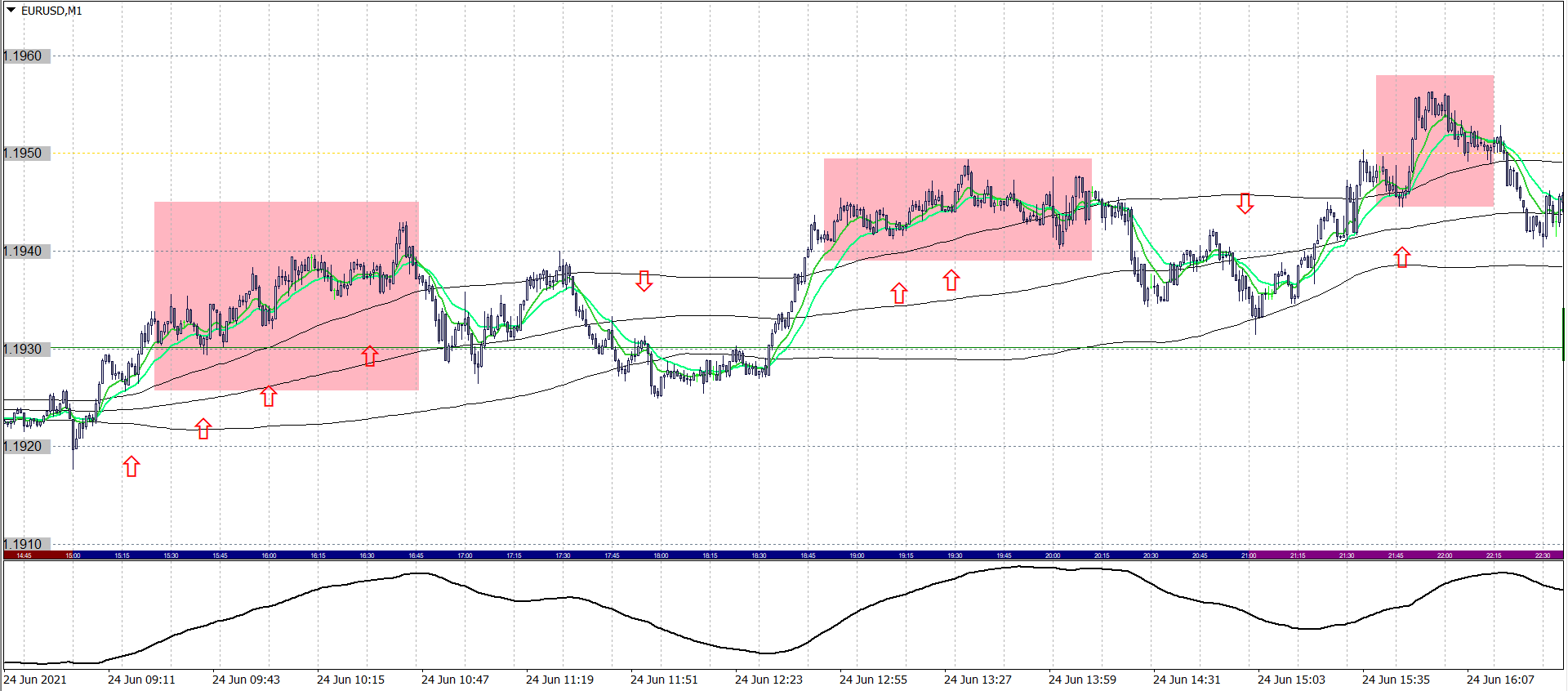 赤矢印:1日+3~10pipsのスキャルロジックによる、エントリーポイント