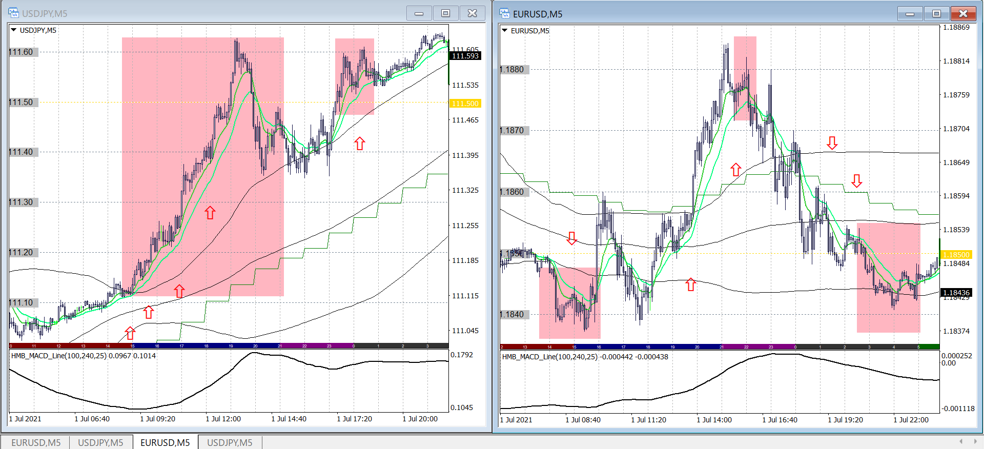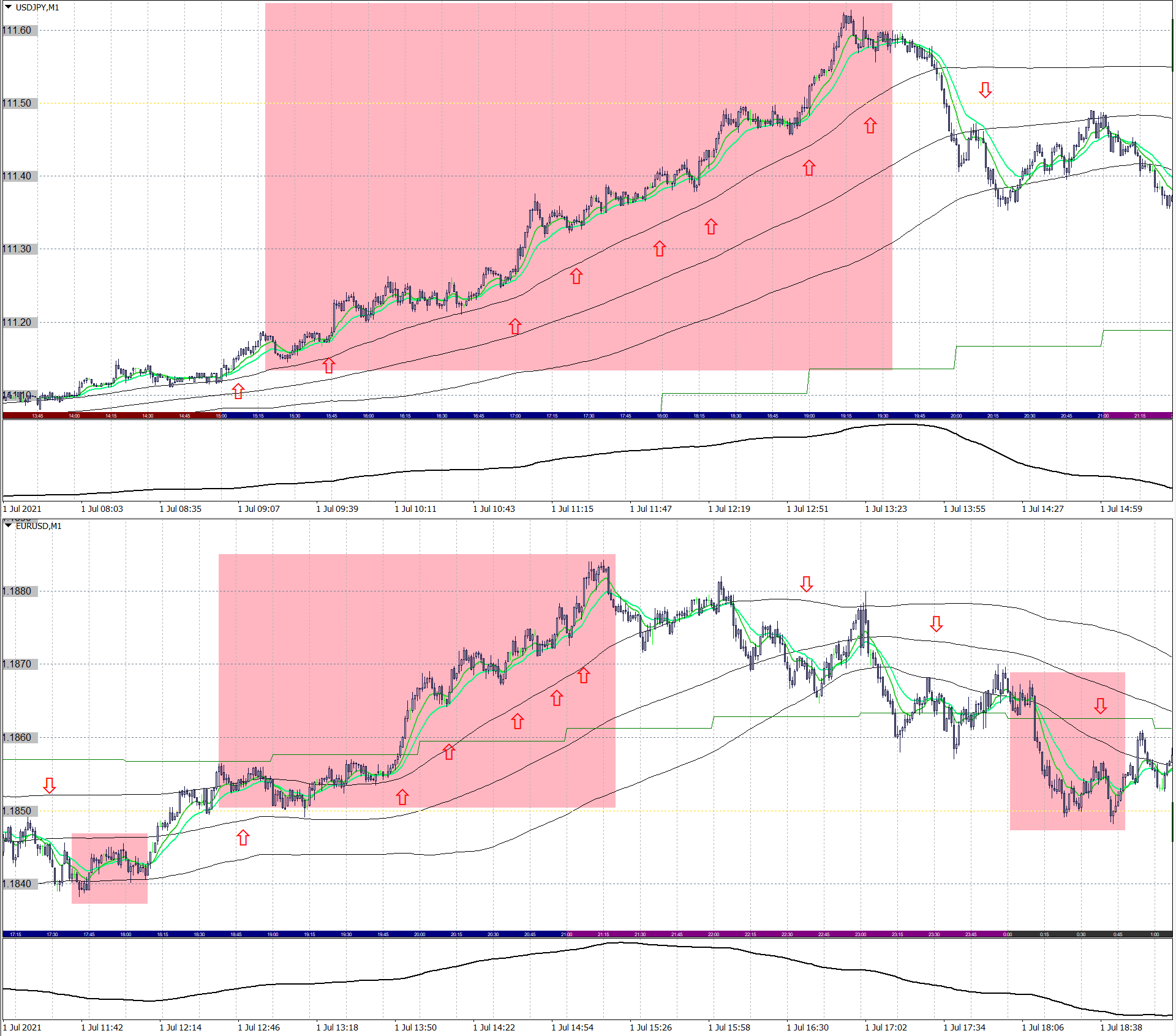 赤矢印:1日+3~10pipsのスキャルロジックによる、エントリーポイント